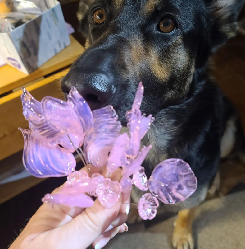 "Elegance was a bit of a diva to work with. While it truly is a beautiful pink, it gave me a bit of a hard time when I blew it. The first item on the left is a blown glass vessel. At first, I was impressed at how easy it was to blow, but then I quickly noted that part of the bubble had devitrified. I had to deconstruct part of the vessel by plucking away the cloudy looking area with tweezers. I then re-melted it and added a layer of pink dichroic glass. It turned out lovely in the end. The second item is a pink bird. One wing scorched a little bit. I had to pluck that part off and try again. My third attempt was to quickly make a tiny blown glass vessel. Once again—devitrification. The fourth set is of two solid glass beads. These turned out perfectly. In summary, from my experience, Elegance is not suited for blowing and doesn’t like to be held in the fire very long."